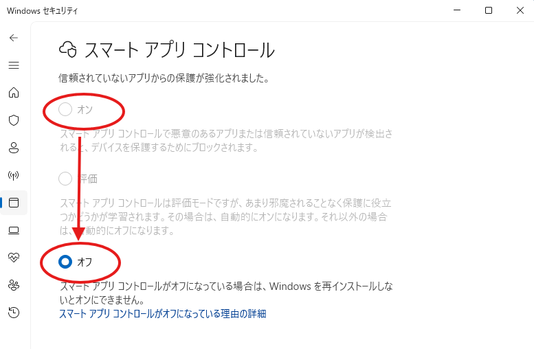以下のスマートアプリコントロール設定が有効な場合、このページの手順でダウンロードした exe がブロックされる。